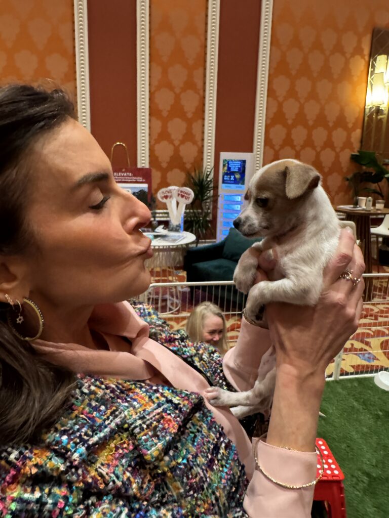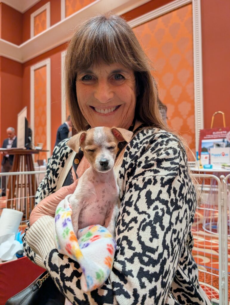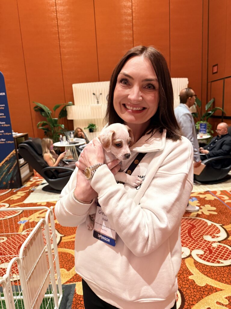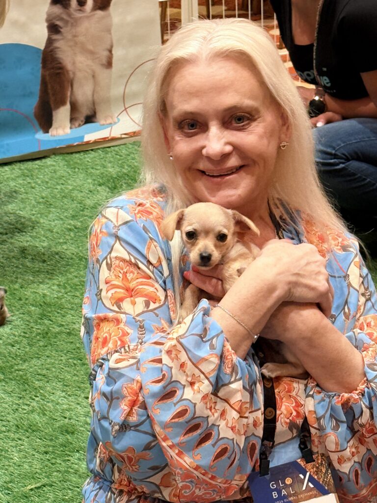 Our Puppy Love Party booth became a sanctuary within the exchange. It offered a place to relax, breathe, and take a much-needed paws during an otherwise fast-paced, high-powered day. In between discussions of capital and continuity, attendees found themselves reconnecting with something simpler and deeply sustaining: the warmth of a small rescue dog resting quietly in their arms.