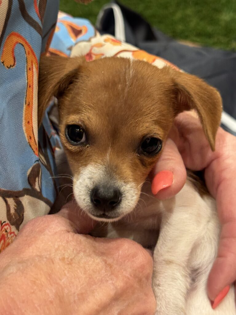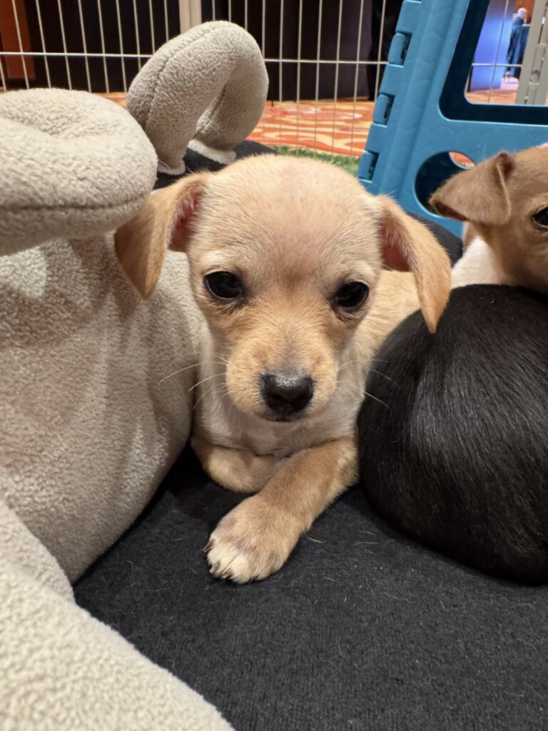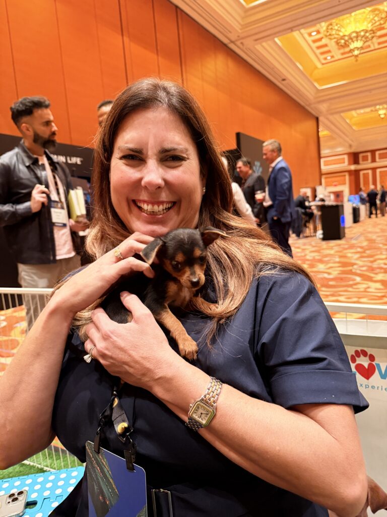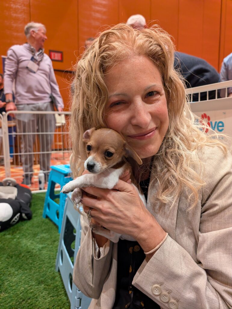 Our Puppy Love Party booth became a sanctuary within the exchange. It offered a place to relax, breathe, and take a much-needed paws during an otherwise fast-paced, high-powered day. In between discussions of capital and continuity, attendees found themselves reconnecting with something simpler and deeply sustaining: the warmth of a small rescue dog resting quietly in their arms.