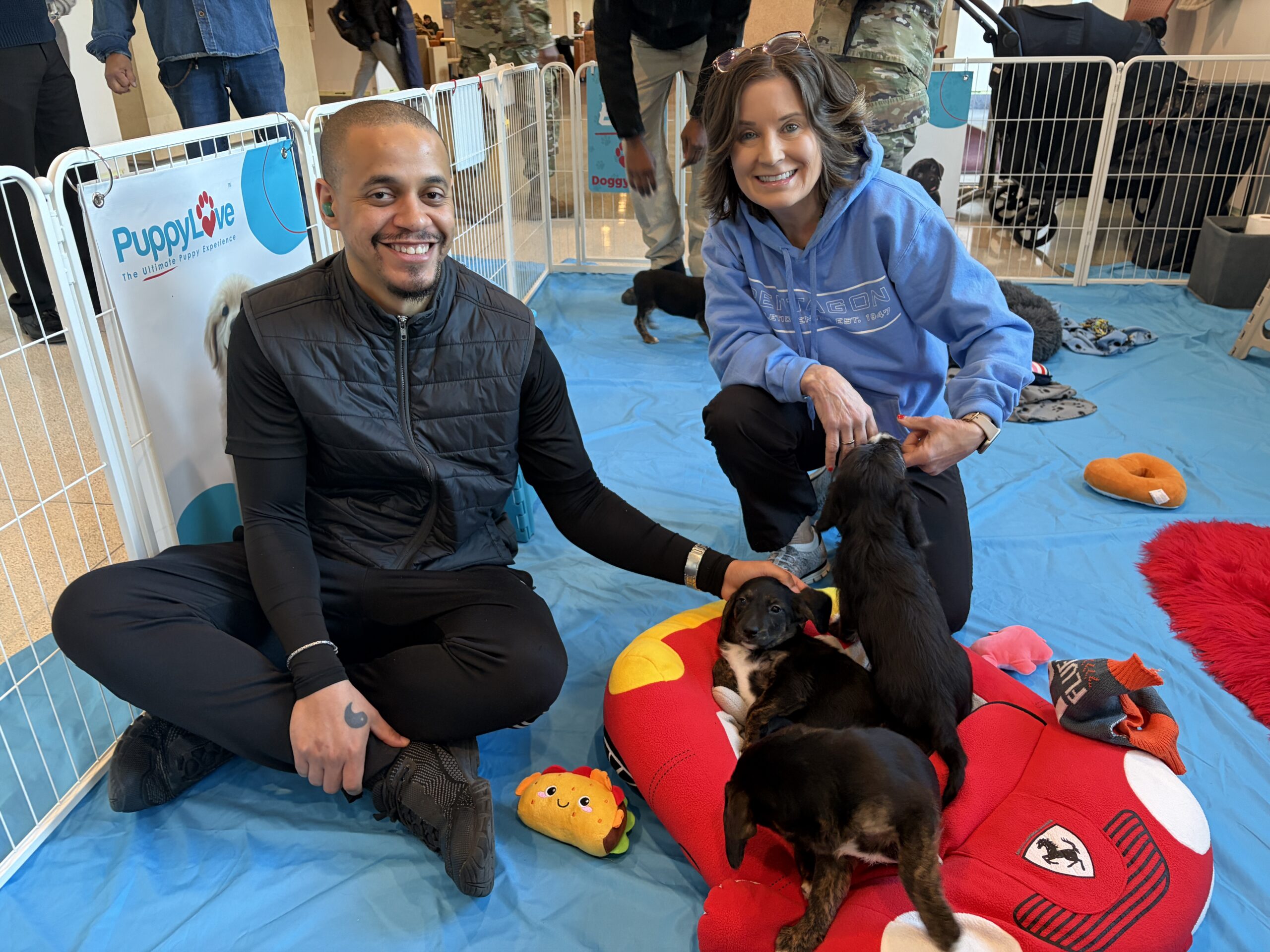 In 2019, while serving on the “E-Ring” of the Pentagon, she hosted a non-profit’s puppy roadshow event where the team socialized “puppies in training” to become veteran dogs. Amanda saw the smiles and happiness her entire office experienced, from young troops to 4-star generals, all from simply snuggling a puppy! It was that day that sparked an idea for a future career to bring joy to coworkers with a wagon full of pups. When she discovered Puppy Love™ on the West Coast and attended 2 events in Las Vegas, she knew it would be her mission to bring this amazing company to the Nation’s Capital.