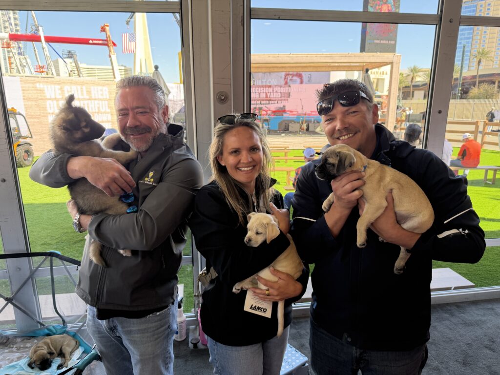 The Puppy Love™ Puppy Park quickly became one of the most talked-about spots on the grounds. For an industry conference attended mostly by men, the response was remarkable. Contractors, engineers, and equipment operators who had spent the morning climbing through excavators or discussing infrastructure strategy suddenly found themselves sitting cross-legged on the turf with a puppy in their lap.